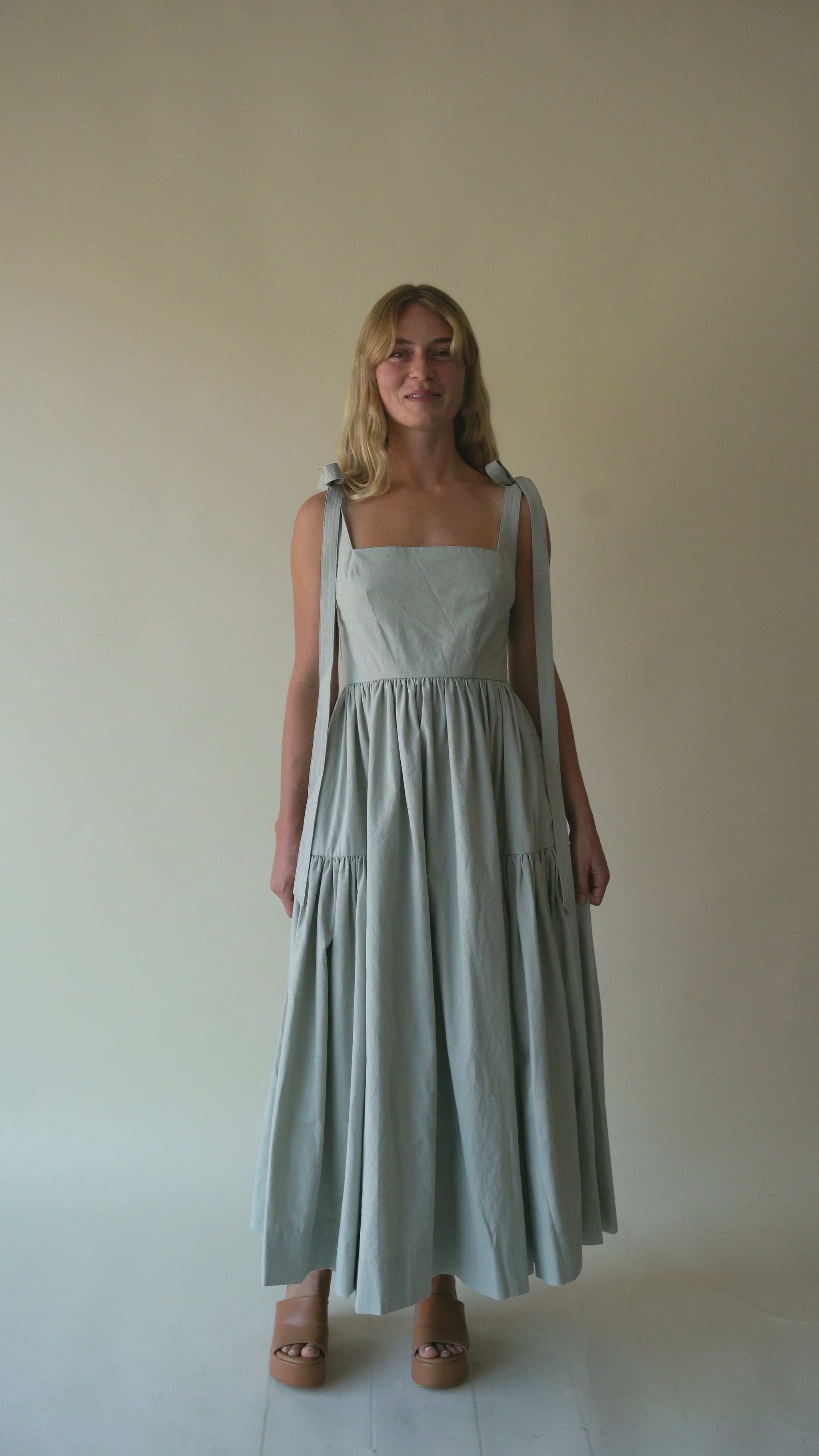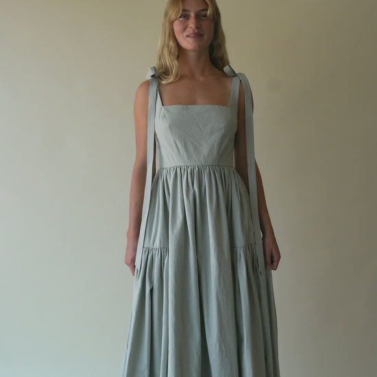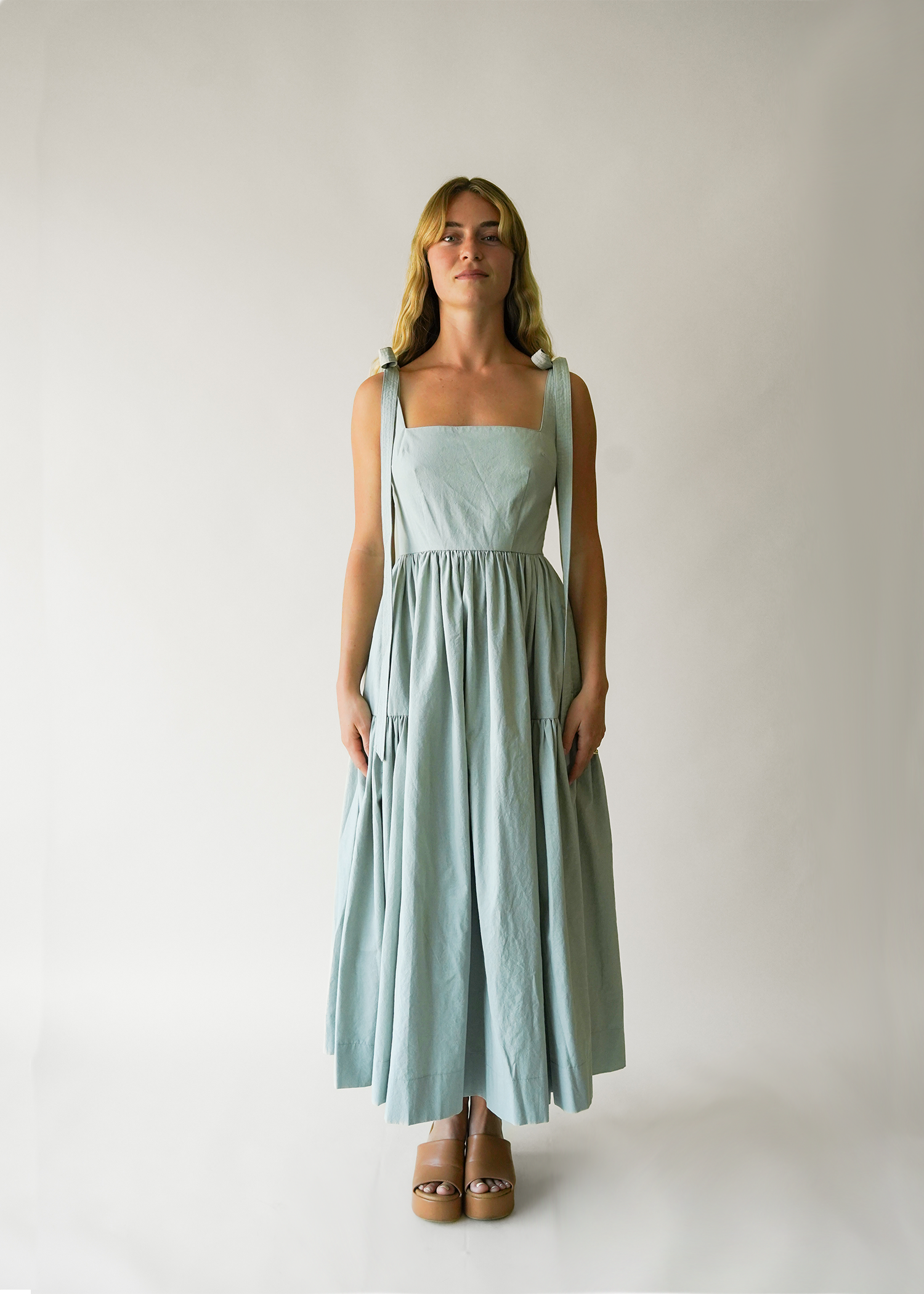The dress features a charming square neckline that beautifully frames your collarbone. The bodice has two bust darts with a gathered full skirt with four additional lower panels that gather into cascading layers, bringing even more volume and fullness to the dress. The pièce de résistance lies in the long straps that gracefully tie into bows around your shoulders. Whether you're attending a special occasion, a garden soiree, or simply want to feel beautiful on any given day, this dress is for you.
